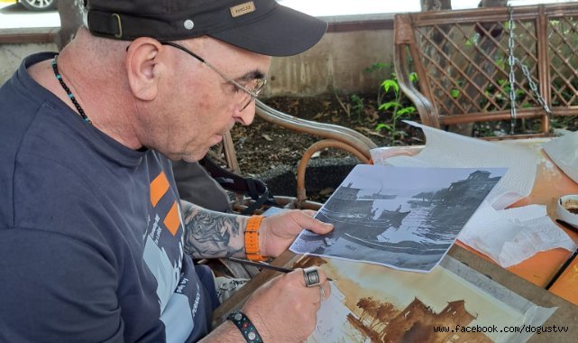Turuncu Art Cafe'de düzenlenen etkinlikte, sanatseverler de kahveyle suluboya yapma tekniğini öğrendi.