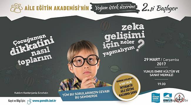 Aile eğitim Akademisi kapsamında anne babaların çocuklarını yetiştirirken daha bilinçli davranması amacıyla pendik Belediyesi Sosyal Destek Hizmetleri Müdürlüğü tarafından düzenlenen seminer ve grup atölye çalışmaları yoğun talep gördü. Bunun üzerine ikincisini düzenleme kararı alındı. ''Çocuklarda Dikkat ve Zeka Becerilerinin Geliştirilmesi'' Eğitim Semineri, 29 Mart Çarşamba Saat 19.00’da Yunus Emre Kültür ve Sanat Merkezi’nde gerçekleştirilecek. Seminere katılım için www.pendik.bel.tr adresi üzerinden kayıt yaptırmak gerekiyor. Kayıt işlemleri 20 Mart tarihinde başlayacak. Kayıt yaptıran ilk 50 kişiye zeka oyunu tangram hediye edilecek. Program sonunda katılımcılar arasında elektronik ortamda yapılacak çekilişte çeşitli hediyeler dağıtılacak.