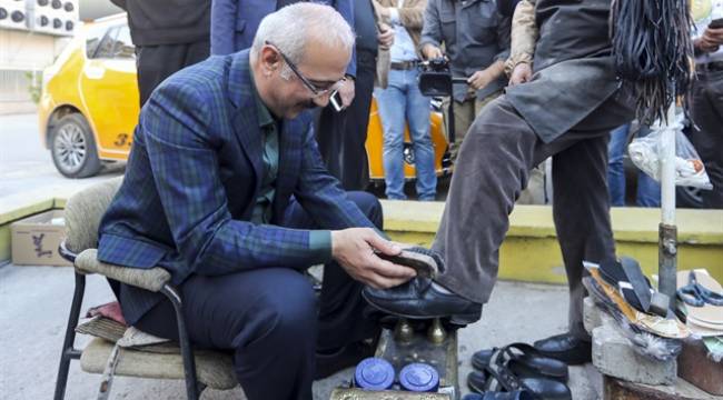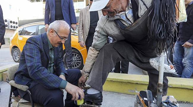 Kalkınma Bakanı Lütfi Elvan, esnaf gezisi sırasında boya sandığının başına geçtiği Salim Tokat'ın ayakkabılarını fırçalayarak cila sürdü.
