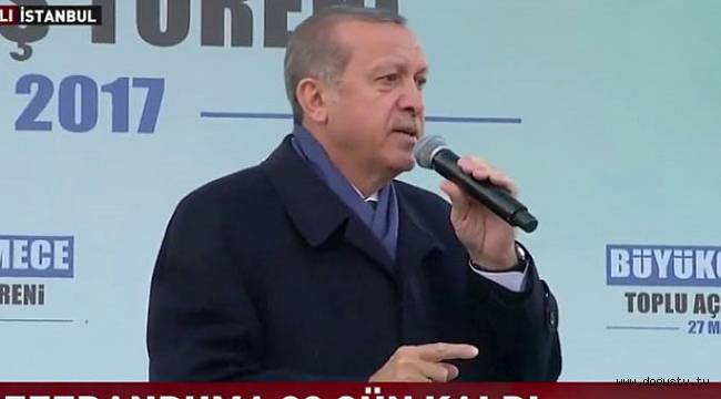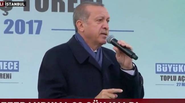 Cumhurbaşkanı recep tayyip erdoğan Büyükçekmece'de vatandaşlara sesleniyor.Erdoğan, konuşmasının başında İsviçre'de yaşanan skandal pankartla ilgili sert sözler sarfetti. Şakağına doğrultulmuş silahlı pankartla ilgili, "Sen benim şakağıma o pankartta silahı dayasan ne yazar. Erdoğan'ı öldürün diyor. Ulan ne yazar. Rabbimin bana verdiği ömrü ne bir an ileri ne bir an geri çekmeye sizin gücünüz yetmez." dedi.Erdoğan'ın konuşmasından satırbaşları:"Bir kaç gün önce İsviçre Parlamentosu'nun önünde pankartta benim şakağıma silah dayamışlar. Sen benim şakağıma o pankartta silahı dayasan ne yazar. Erdoğan'ı öldürün diyor. Ulan ne yazar. Rabbimin bana verdiği ömrü ne bir an ileri ne bir an geri çekmeye sizingücünğüz yetmez. Biz bu yola kefenimizle çıktık. Kefenimizle yürüyoruz be. Biz bu millete efendi olmaya değil hizmetkar olmaya geldik. İsviçre devleti rahatça kinlerini kussunlar niye bunları koruyor. Almanya öyle Hollanda öyle. Bir devlet başkanını gözünüzün önünde tehdit edecekler siz destekleyeceksiniz yazıklar olsun size.'BATI ESKİ KARANLIK GÜNLERİNE DÖNÜYOR'Türkiye'ye karşı sergilenen faşist tavırlar, Batı'yı eski karanlık günlerine götürüyor. Yapılan faşizm ise buna faşizm denilmesinden kimse rahatsızlık duymasın. Batılılara diyorum ki, müslümanlara karşı ön yargılarınızdan vazgeçin ve samimi uyarılarımıza kulak verin.