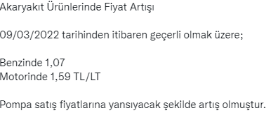 Enerji Petrol Gaz İkmal İstasyonları İşveren Sendikası'ndan (EPGİS) alınan bilgiye göre, benzine 1,07 TL motorine ise 1,59 TL zam geldi.