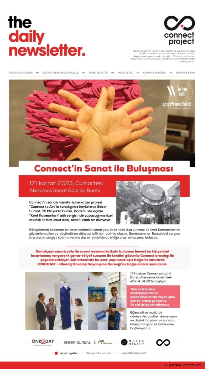 Fikir Connect’ten emek sanatçı Ekber Sürsal’dan. Yeter ki iyilik olsun, çocukların yüzü hep gülsün...Connect’in sanatı hayatın içine katan projesi ‘’Connect To Art’’ ile sanatçı Ekber Sürsal, Sürsal’ın yeni sergisi ‘’Kent Katmanları’nın sergilendiği Bursa Akeramos Sanat Merkezi’nde sıra dışı bir çalışma gerçekleştirecek.Sanatçı Ekber Sürsal’ın ‘’Kent Katmanları’’ sergisi ile düşündüren dünyası ve her bir projesinin sonunu iyiliğe bağlayan ‘’Connect’’ ekibi 17 Haziran Cumartesi Günü anlamlı bir etkinliğe imza atacak.‘’Connect To Art’’ aracılığı ile Ekber Sürsal etkinlik için tasarladığı rengarenk özel çanta 17 Haziran Cumartesi Günü saat 14.00’da yapılacak açık bağış sistemiyle satılacak. Bağış için elde edilen gelirin tamamı Uludağ Onkoloji Dayanışma Derneği ONKODAY’ bağış olarak sunulacak.Tüm destekçilerin, dostların ve sanatseverlerin bir araya geleceği bu dayanışmanın tek bir amacı var o da iyiliğe aracı olmak.Hem eğlenceli hem mutluluk veren bir deneyimle dayanışma ve destek büyüyor diyen ‘’Connect’’ ekibi, Ekber Sürsal’ın emeği ve sanatın birleştirici gücü ile birbirlerine daha çok bağlandıklarını söylüyor.
