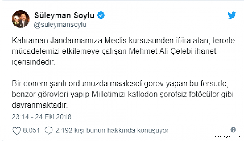 Çelebi’nin açıklamalarına İçişleri Bakanı Süleyman soylu sosyal medya hesabından tepki gösterdi. Soylu paylaşımında, “Kahraman Jandarmamıza Meclis kürsüsünden iftira atan, terörle mücadelemizi etkilemeye çalışan Mehmet Ali Çelebi ihanet içerisindedir. Bir dönem şanlı ordumuzda maalesef görev yapan bu fersude, benzer görevleri yapıp Milletimizi katleden şerefsiz FETÖ’cüler gibi davranmaktadır” dedi.