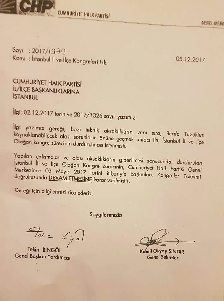 Yapılan çalışmalar ve olası aksaklıkların giderilmesi sonucunda İstanbul İl ve İlçe Olağan Kongre sürecinin Cumhuriyet Halk Partisi Merkezince 30 Mayıs 2017 tarihi itibariyle başlatılan, Kongreler Takvimi doğrultusunda DEVAM ETMESİNE karar verilmiştir”