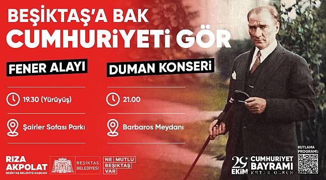 Beşiktaş Belediyesi, 29 Ekim Cumhuriyet Bayramı’nın 99. Yıl dönümünü Fener Alayı ve Duman konseriyle kutlayacak. Beşiktaş Belediye Başkanı Rıza Akpolat “Herkesi Beşiktaş’ta Cumhuriyetimize sahip çıkmaya ve Bayramımızı coşkuyla kutlamaya davet ediyorum.” dedi.Gazi Mustafa Kemal Atatürk ve silah arkadaşlarının Kurtuluş Savaşı için ilk adımı attığı ve milli mücadelenin fitilini ateşlemek için yola çıktığı Beşiktaş’ta 29 Ekim Cumhuriyet Bayramı’nın 99. yılı çeşitli etkinliklerle kutlanacak. Kutlamalar, resmi tören programıyla başlayacak. 29 Ekim günü Beşiktaş’ta gündüz saatlerinden itibaren Cumhuriyet Bayramı coşkusunu yansıtan marşlar ilçenin cadde ve sokaklarında ses ve anons araçlarından yükselerek yurttaşlara doyasıya yaşatılacak.ŞAİRLER SOFASI PARKI’NDA FENER ALAYI YÜRÜYÜŞÜSaatler 19.30’u gösterdiğinde ise Beşiktaş Belediye Başkanı Rıza Akpolat öncülüğünde; genci, yaşlısı binlerce vatandaş Beşiktaş Şairler Sofası Parkı önünde buluşarak ellerinde Türk bayrakları, Atatürk posterleri, meşaleler ile dillerinde marşlarla birlikte Barbaros Meydanı’na yürüyecek.DUMAN GRUBU 29 EKİM’DE BEŞİKTAŞ’TA SAHNE ALACAKGecenin finalinde ise Hepsiburada’nın katkılarıyla saat 21.00’da Duman konseri gerçekleşecek. Duman grubu 29 Ekim Cumhuriyet Bayramı’nın 99. Yıl dönümüne özel dinleyenleriyle buluşacak ve birbirinden güzel şarkılarını Beşiktaş’ta seslendirerek Cumhuriyet coşkusunu doruklara taşıyacak.Program: