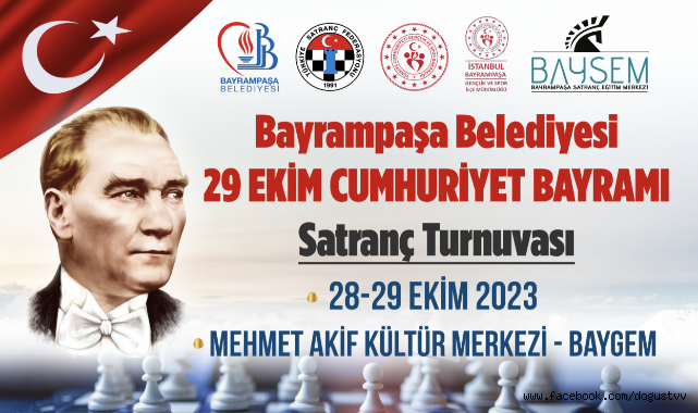Bayrampaşa Belediyesi, Bayrampaşa Kaymakamlığı, Bayrampaşa GSİM ve BAYSEM’in katkıları, TSF Bayrampaşa İlçe Temsilciliği’nin organizasyonuyla Cumhuriyetin 100. yılına özel 29 Ekim Cumhuriyet Kupası Satranç Turnuvası düzenleniyor. 28-29 Ekim’de Mehmet Akif Ersoy Kültür Merkezi’nde düzenlenecek turnuva, 8-10-12 yaş altı olmak üzere toplam 3 kategoride gerçekleştirilecek. Turnuvaya katılmak isteyenler kayıtlarını istanbul.tsf.org.tr web sayfasından online olarak yaptırabilecek. Turnuva sonunda dereceye girecek sporcuları kupa ve madalyanın yanı sıra toplamda 12 bin TL ödül bekliyor.
