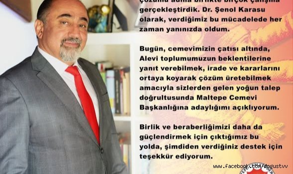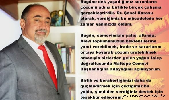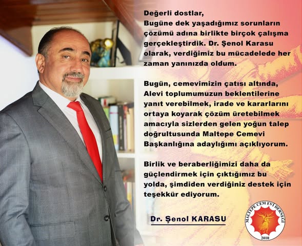 Halkın içinden gelen bir isim olarak tanınan Dr. Şenol Karasu’nun, cemevimizin çatısı altında Alevi toplumunun beklentilerine cevap vereceği, irade ve kararlarını ortaya koyacağı, birlik ve beraberliği güçlendireceği bir yönetim sergileyeceğine olan inancımız tamdır.