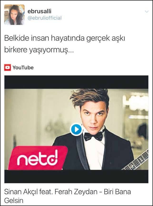 Herkes Ebru Şallı'nın Cem Yılmaz'la yeniden bir araya gelip gelmeyeceğini merak ederken dün güzel sunucunun cephesinden akılları karıştıran bir hareket geldi… Şallı, Twitter hesabından eski aşkı Sinan Akçıl'ın 'Biri Bana Gelsin' adlı şarkısını "Belki de insan hayatında gerçek aşkı bir kere yaşıyormuş" notuyla paylaşınca hayranları dahil herkesi şaşırttı.