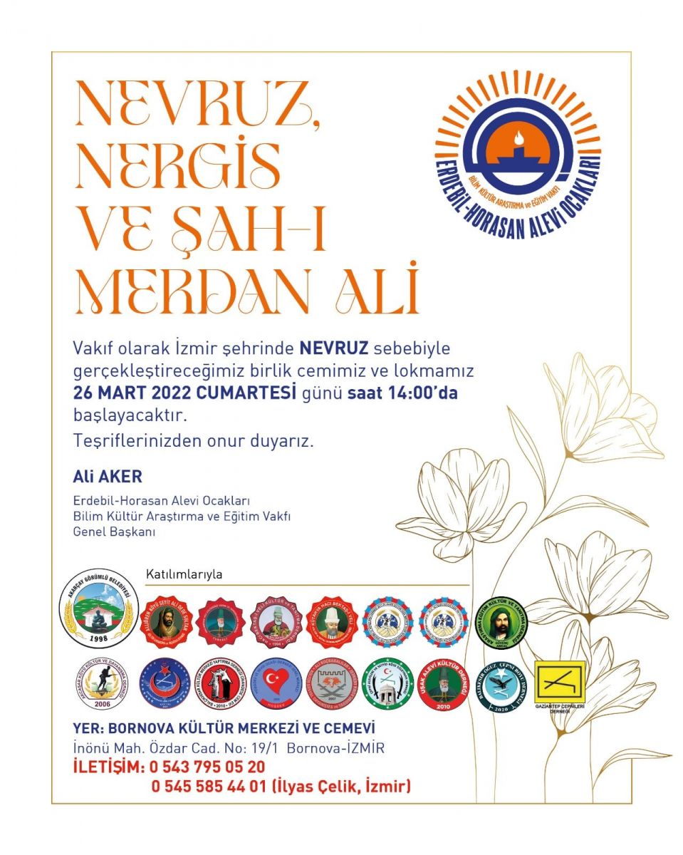 Erdebil Horasan Alevi Ocakları Bilim Kültür Araştırma Ve Eğitim Vakfı “Nevruz Nergis ve Şah-ı Merdan Ali” adıyla 26 Mart 2022 cumartesi günü İzmir’de Birlik Cemi ve Lokma İkramı gerçekleştirecek. Etkinliğe Türkiye’nin başta İzmir olmak üzere Kütahya, Balıkesir, Gaziantep, Ordu, Tunceli, Samsun, Uşak, Eskişehir, Amasya ve Tokat gibi onlarca ilinden misafirin katılacağı belirtildi.