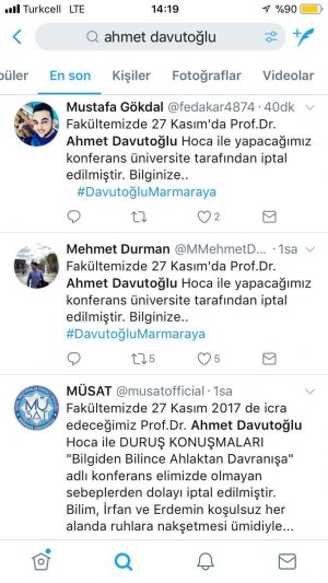 Davutoğlu'na yakın bir kaynak, "Bu iptal üniversite yönetiminin inisiyatifiyle oldu. Hoca daha önce bu üniversitede öğretim üyeliği yapmış biri, şimdi bu üniversitede konuşamıyor" dedi.Marmara Üniversitesi Sosyal Araştırmalar Öğrenci Topluluğu, Prof. Dr. Ahmet Davutoğlu'nun "Duruş" adlı yeni kitabıyla ilgili olarak "Bilgiden Bilince Ahlaktan Davranışa" başlıklı bir konferans düzenleyeceğini duyurmuştu.27 Kasım tarihinde yapılacağı daha önce açıklanan bu konferans bugün iptal edildi. Öğrenci topluluğu, "elimizde olmayan sebeplerden dolayı" konferansın iptal edildiğini açıkladı. Grup üyesi öğrenciler de üniversite yönetiminin böyle bir karar aldığını belirttiler.