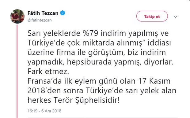 "Sarı yeleklerde yüzde 79 indirim yapılmış ve Türkiye'de çok miktarda alınmış iddiası üzerine firma ile görüştüm, biz indirim yapmadık, hepsiburada yapmış, diyorlar. Fark etmez. Fransa'da ilk eylem günü olan 17 Kasım 2018'den sonra Türkiye'de sarı yelek alan herkes terör şüphelisidir."