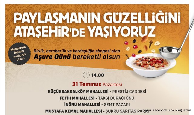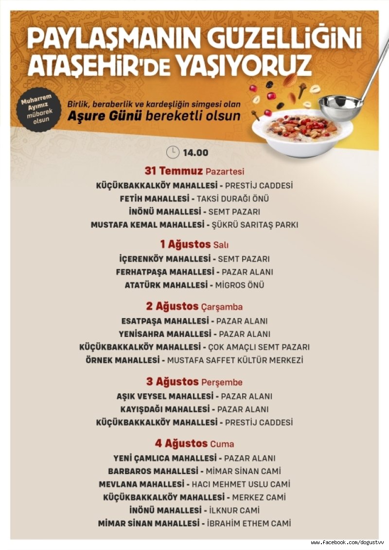 Ataşehir Belediyesi aşevinde; hijyenik koşullarda ve özenle hazırlanan aşurelerde; buğday, badem, fındık, fıstık, ceviz, kayısı, incir, kuru üzüm, kuş üzümü, nohut, kuru fasulye ve şekerden oluşan 12 çeşit malzeme kullanılacak. Aşure dağıtımları her gün saat 14.00’da başlayacak.Aşure dağıtımının ilki 31 Temmuz Pazartesi günü; Küçükbakkalköy Mahallesi Prestij Caddesi, Fetih Mahallesi Taksi Durağı Önü, İnönü Mahallesi Semt Pazarı ile Mustafa Kemal Mahallesi Şükrü Sarıtaş Parkı önünde yapılacak. Aşure dağıtımın başlangıcı olması nedeniyle ayrıca Küçükbakkalköy Mahallesi Prestij Caddesi’nde aşure kazanı kurularak vatandaşlara sıcak aşure ikramında bulunulacak.Aşure ikramları 1 Ağustos Salı günü; İçerenköy Semt Pazarı, Ferhatpaşa Mahallesi Pazar Alanı ve Atatürk Mahallesi Migros önünde dağıtılmaya devam edecek.2 Ağustos Çarşamba günü; Esatpaşa Mahallesi Pazar Alanı, Yenisahra Mahallesi Pazar Alanı, Küçükbakkalköy Mahallesi Çok Amaçlı Semt Pazarı ve Örnek Mahallesi Mustafa Saffet Kültür Merkezi önünde aşure dağıtım gerçekleştirilecek.3 Ağustos Perşembe günü yapılacak aşure dağıtımı; Aşık Veysel Mahallesi Pazar Alanı, Kayışdağı Mahallesi Pazar Alanı ile Küçükbakkalköy Mahallesi Prestij Caddesi’nde gerçekleştirilecek.4 Ağustos Cuma günü ise; Yeni Çamlıca Mahallesi Pazar Alanı, Barbaros Mahallesi Mimar Sinan Cami, Mevlana Mahallesi Hacı Mehmet Uslu Cami, Küçükbakkalköy Mahallesi Merkez Cami, İnönü Mahallesi İlknur Cami ve Mimar Sinan Mahallesi İbrahim Ethem Cami önünde Aşure dağıtımı yapılacak.