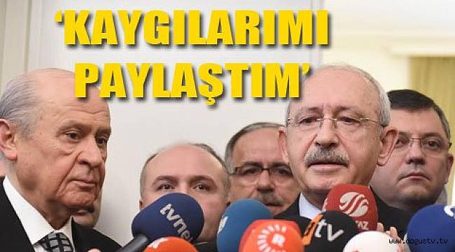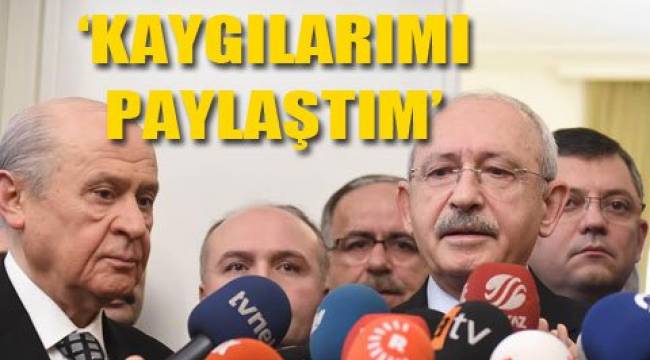 CHP Genel Başkanı Kemal Kılıçdaroğlu, TBMM’de bugün 2. turu başlayacak anayasa değişikliği görüşmeleriyle ilgili olarak mhp Genel Başkanı Devlet Bahçeli’yi ziyaret etti.45 dakikalık görüşmenin ardından iki lider açıklama yaptı.Kılıçdaroğlu görüşme sonrası "MHP Türk demokrasi tarihinin çok önemli bir partisidir. Benim şahsen görüşmeye ihtiyacım vardı. Sayın başkanı ziyaret ettim. Lütfedip kabul ettiler. Anayasa değişikliği ile ilgili kaygılarımı paylaştım. Kendisine çok teşekkür ederim" diye konuştu.Devlet bahçeli ise, “Sayın genel başkan gerekeni söyledi” demekle yetindi.