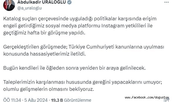 Bilgi Teknolojileri ve İletişim Kurumu'nun (BTK) popüler sosyal medya platformu Instagram'a uyguladığı erişim engeli sürüyor.Cuma gününden bu yana erişime kapalı olan Instagram'ın açılması içinse bugün önemli bir görüşme gerçekleşiyor. Masada BTK, Ulaştırma ve Altyapı Bakanlığı ile Instagram yetkilileri var.Görüşmeyle öncesi açıklama yapan Altyapı Bakanı Abdulkadir Uraloğlu şunları kaydetti; "Katalog suçları çerçevesinde uyguladığı politikalar karşısında erişim engeli getirdiğimiz sosyal medya platformu Instagram yetkilileri ile geçtiğimiz hafta bir görüşme yapıldı. Gerçekleştirilen görüşmede; Türkiye Cumhuriyeti kanunlarına uyulması konusunda hassasiyetlerimiz iletildi. Bugün kendileri ile öğleden sonra yeniden bir araya gelinilecek. Taleplerimizin karşılanması hususunda gereğini yapacaklarını umuyor; olumlu gelişmelerin olmasını bekliyoruz."Instagram aylık 2 milyardan fazla aktif kullanıcısıyla Facebook ve YouTube'un arından dünya genelinde en fazla kullanılan platform. Türkiye 57,1 milyon kullanıcısıyla, dünyada en fazla instagram kullanan beşinci ülke.