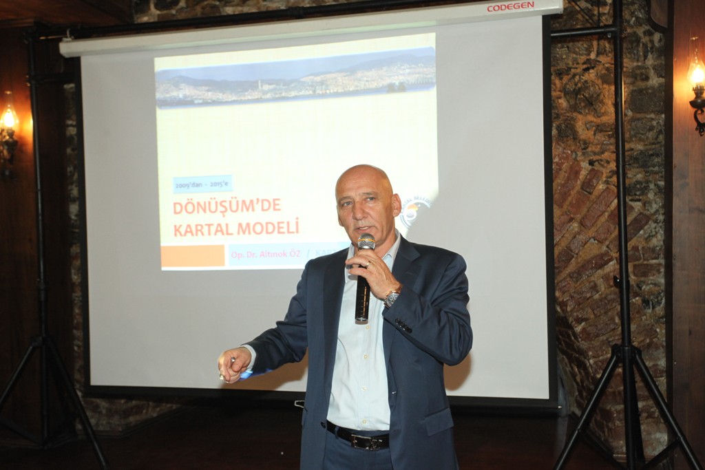 Kartal Belediye Başkanı Op. Dr. Altınok Öz, toplantıda Kartal’ı tanıtarak ve hem coğrafi hem demografik yapı hakkında bilgi verdi. Başkan Altınok Öz, “Kartal, Kayış dağı ile Aydos dağı arasında, arkada Sancaktepe, Batı’da Maltepe, Doğu’da Pendik ve denizi olan bir ilçe. Çok önceleri Bostancı’dan Gebze’ye kadar olan büyük bir ilçeydi Kartal. Kartal Belediyesi 1860 yıllarında var olan bir belediyedir. Kartal, sakin bir ilçeyken 1947 yılında İstanbul’a yakın ama İstanbul’un dışında bir fonksiyonla sanayi ile canlanıyor. Sanayi Kartal’a taşınıyor. Hal böyle olunca Kartal, sanayi kenti olarak anılmaya başlıyor ve sanayide çalışan emekçilerle Milli Emlak’ın, devletin ya da şahsın arsasında bir inşaat faaliyeti başlıyor. Ve böylece bir çarpık yerleşim söz konusu oluyor. Yıllar sonra devlet, iki tane yasa çıkarıyor önce 775 sayılı gece kondu, arkasından 1984 yılında 2981. Af Kanunu çıkıyor. Yerel yönetim, bu çıkan yasalardan yararlanmadığı için ve imar ıslah çalışmaları doğru yapılmadığı için çarpık kentleşme devam etmeye başlıyor ve düzeltilemiyor. 1980’li yıllarda ikinci bir dönüşüm başlıyor. Toplu konutlar yapılarak yeni yerleşim modelleri oluşuyor. Bu dönüşüm modeliyle Kartal’da 359 site yapıldı. Bu sitelerden 107 tanesi 775’e tabi olmak üzere yeni bir mahalle kuruluyor. Mahallenin adı ise Uğur Mumcu oluyor. Kalan 252 site de Kartal’ın merkezinde yer alıyor. Bu sitelerden 83 tanesi 2001 depreminden sonra yapıldığı için Kartal Belediyesi’nin çalışma alanı dışında tuttuğu kısımdır. Kartal Belediyesi olarak toplam 169 siteyi incelemeye aldık” diye konuştu
