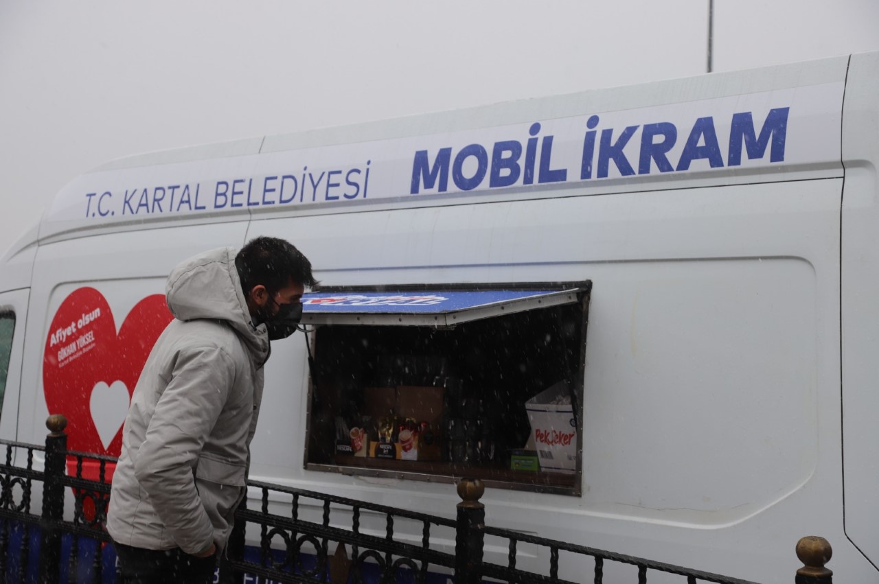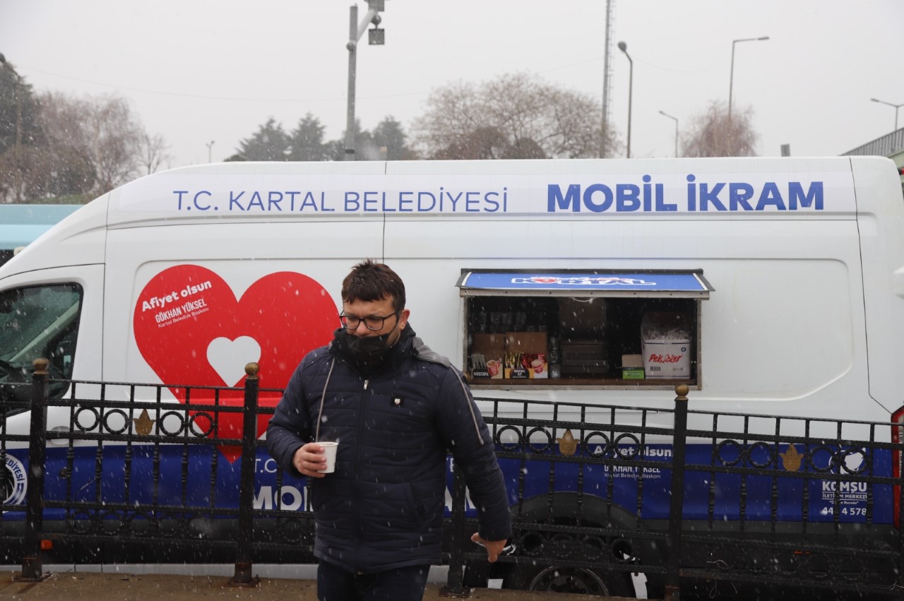 Kartal Belediyesi, İstanbul’u ve Kartal’ı etkisi altına alan soğuk ve karlı havada, günlük hayatına devam eden vatandaşların soğuktan olumsuz etkilenmemeleri için Mobil İkram Araçları ile sıcak çorba ve çay ikramında bulunuyor.