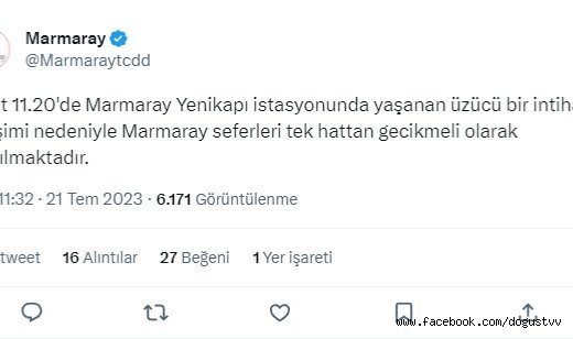 Marmaray'ın resmi sosyal medya hesabından yapılan duyuruda saat 11.20'de meydana gelen intihar girişimi nedeniyle seferler tek hattan gecikmeli olarak yapılıyor. Marmaray'ın sosyal medya hesabından konuya ilişkin açıklamada "Saat 11.20'de marmaray Yenikapı istasyonunda yaşanan üzücü bir intihar girişimi nedeniyle Marmaray seferleri tek hattan gecikmeli olarak yapılmaktadır" açıklamasında bulunuldu. Marmaray'da yaşanan üzücü olayın ardından yolcular, seferlerin 1 saat kadar geciktiğini ileri sürerek sosyal medyadan isyan etti.