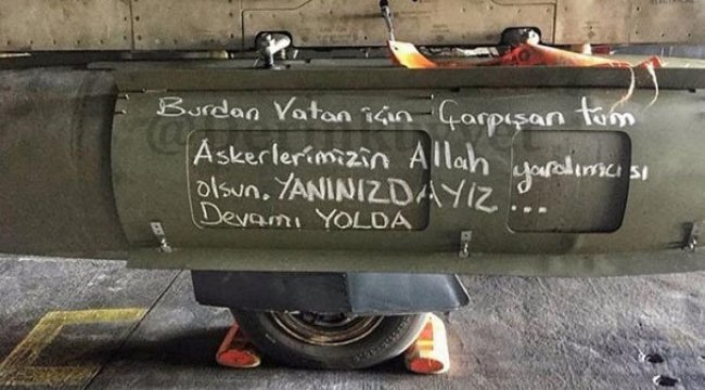 Askerler, hava operasyonunda kullanılan bombalara anlamlı mesajlar yazdı: Buradan vatan için çarpışan tüm askerlerimizin Allah yardımcısı olsun. YANINIZDAYIZ! Devamı YOLDA