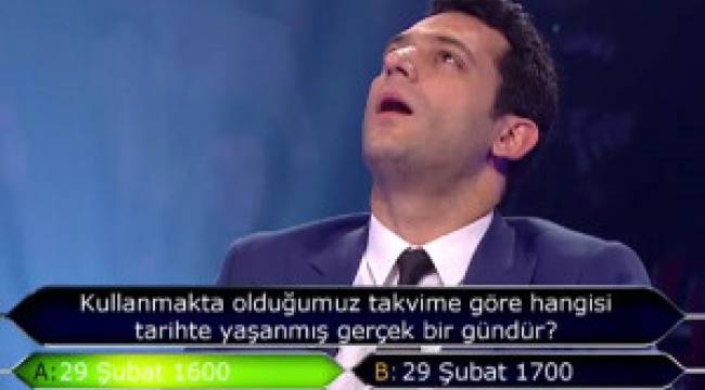 "Kullanmakta olduğumuz takvime göre hangisi tarihte yaşanmış gerçek bir gündür?" sorusunun doğru cevabı 29 Şubat 1600 olarak açıklandı. murat yıldırım sunuculuğunda ilk kez 1 Milyon'luk sorunun eşiğinden dönüldü.