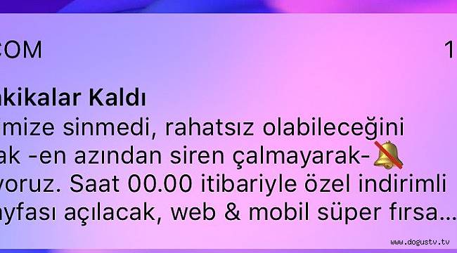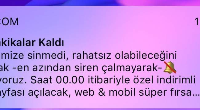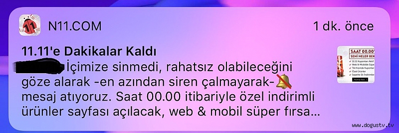 e-ticaret sitesi n11.com’un, uygulamasını telefonuna indiren vatandaşlara gönderdiği bildirim tepkilere neden oldu. Atatürk’e büyük saygısızlık yapılan mesajda "İçimize sinmedi, rahatsız olabileceğini göze alarak – en azından siren çalmayarak- mesaj atıyoruz. Saat 00.00 itibarıyla özel indirimli ürünler sayfası açılacak…" ifadelerine yer verildi.