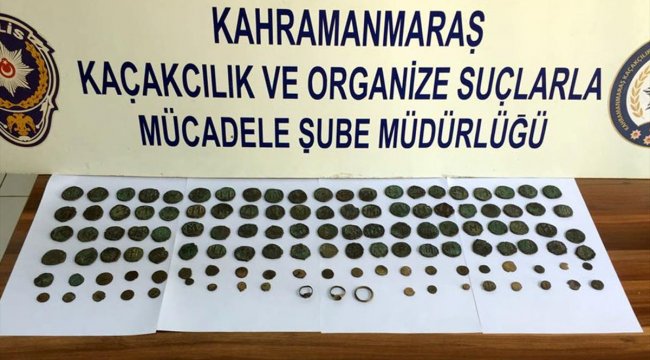Kahramanmaraş Emniyet Müdürlüğü Kaçakçılık ve Organize Suçlarla Mücadele Şube ekipleri, ihbar üzerine Gaziantep yolu Güzelyurt Mahallesi girişindeki uygulama noktasında bir yolcu otobüsü durdurdu.Otobüste, Y. Z. isimli yolcunun yanında bulunan çanta içerisinde 122 sikke ve 3 halka yüzük ele geçirildi.Müze müdürlüğü yetkililerinin yaptığı ilk incelemede, şüpheli Y.Z'nin çantasında ele geçirilen sikkelerin Roma ve Bizans dönemine ait olduğunu belirledi.Şüpheli Y.Z. polis ekiplerince gözaltına alındı.