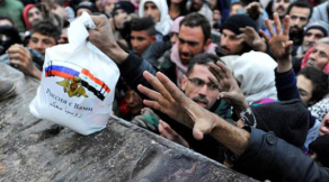Suriye'nin kuzeyindeki Halep'te hafta sonundan bu yana şiddetlenen çatışmalar, dün onlarca kişinin ölümüne yol açtı. Cub el Kubbe semtinde hava saldırısına hedef olan sivillerin cesetleri sokaklara saçıldı.Rejimin ele geçirdiği bölgelerden göç eden sığınmacı grubu, daha güvenli bir yere ulaşmak için bavullarıyla kaçmaya çalışırken yine rejim tarafından vuruldu.RUSYA VE surİye BAYRAĞI BİR ARADAKaçmayı başaranların hali de perişan. Uluslararası haber ajansları, bölgeden sivillerin yiyecek yardımı almak için birbirini ezdiği fotoğraflar geçiyor. Fotoğraflarda dikkat çeken ayrıntı ise, dağıtılan yardım poşetlerinin üzerinde rusya ile Suriye bayrağının birlikte yer alması ve Rusça yazılar olması. Dağıtılan yardım paketlerinde Rusça, "Rusya sizinledir" yazması tepki gördü.