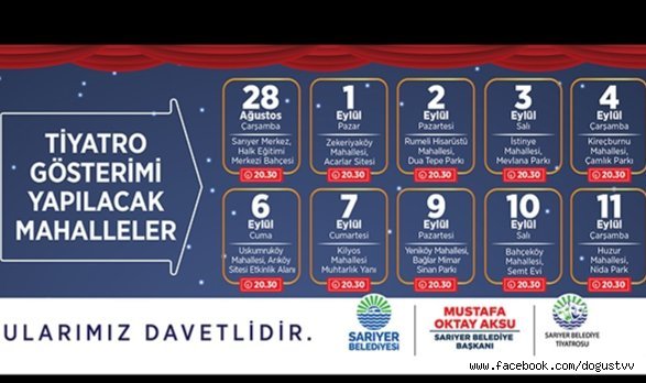 Sarıyer Belediyesi tarafından 14.sü düzenlenen Mahallelerde Tiyatro Şenliği kapsamında, on ayrı noktada ‘Anormal-Normal adlı oyun seyircileriyle buluşacak. Sarıyer Belediyesi Tiyatro Topluluğu Genel Yönetmeni M. Gökhan Bulut’un yazıp yönettiği “Anormal-Normal’ oyunu Sarıyerlilere yıldızların altında eğlenceli saatler yaşatacak.BAŞKAN AKSU: KOMŞULARIMIZA KEYİFLİ SEYİRLER DİLİYORUMBu etkinlikle komşularına kültür sanata erişim kolaylığı sağladıklarını ifade eden Sarıyer Belediye Başkanı Mustafa Oktay Aksu, “Özellikle bir takım nedenlerle kültür sanat etkinliklerine ulaşamayan komşularımız için özel bir çalışma. Bundan önce de açık havada çocuk sinema günlerimizi düzenledik. Komşularımız çok memnun kaldılar. Belediyemiz tiyatro topluluğunun hazırladığı bu oyununun ilgiyle izleneceğine inanıyor, şimdiden tüm komşularımıza keyifli seyirler diliyorum” dedi.“Normal ne?, Anormal ne?” sorularının cevabını arayan bir grup arkadaşın kendi hikayelerini anlattığı oyunda normalliğin ve anormalliğin sınırları zorlanıyor. 11 Eylül’e kadar saat 20.30’da farklı mahallelerde ücretsiz olarak sahnelenecek oyunun takvimi şöyle:28 Ağustos Çarşamba Sarıyer Halk Eğitimi Merkezi Bahçesi01 Eylül Pazar Acarlar Sitesi02 Eylül Pazartesi Rumeli Hisarüstü Mahallesi- Dua Tepe Parkı03 Eylül Salı İstinye Mahallesi-Mevlana Parkı04 Eylül Çarşamba Kireçburnu Mahallesi- Çamlık Parkı06 Eylül Cuma Uskumruköy - Arıköy Sitesi Etkinlik Alanı07 Eylül Cumartesi Kilyos -Muhtarlık Yanı09 Eylül Pazartesi Yeniköy Mahallesi -Bağlar Mimar Sinan Parkı10 Eylül Salı Bahçeköy Semt Evi11 Eylül Çarşamba Huzur Mahallesi- Nida Park