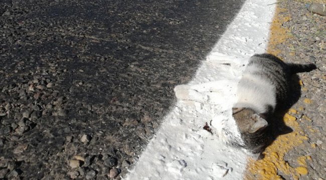 Şok görüntü! Yol çizgi çalışması yapan ekipler ölü kediyi de çizdi…