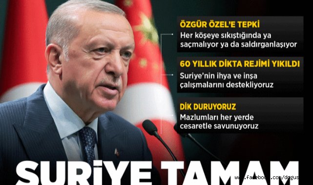 Cumhurbaşkanı Erdoğan, AK Parti Kongre Merkezi'nde Dünya İnsan Hakları Günü “İnsanlık İçin Güçlü Türkiye" programında konuştu. Suriye devriminin son 1 yılda en zoru geride bıraktığını söyleyen Erdoğan, 'Türkiye ve Türk milleti olarak Suriyeli kardeşlerimizin inşa, ihya, toparlanma çabalarını tüm imkanlarımızla destekliyoruz.' dedi. Erdoğan, 'Filistin’de özgürlük ve barış gelecek. 1967 sınırlarında başkenti Doğu Kudüs olan egemen bir Filistin devleti muhakkak Allah’ın izniyle kurulacak.' ifadelerini de kullandı.
