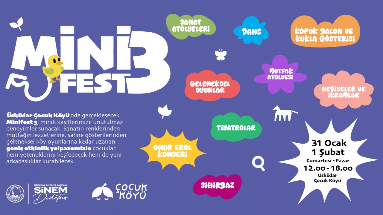 Üsküdar Belediyesi tarafından çocuklar ve gençlerin günlük yaşamlarına neşe katmak amacıyla düzenlenen MiniFest’in üçüncüsü, 31 Ocak–1 Şubat tarihlerinde Üsküdar Çocuk Köyü’nde çocukları ve aileleri eğlence, sanat ve keşifle dolu iki günle buluşturuyor.Çocuklara yönelik hazırlanan MiniFest 3; sanat atölyelerinden sahne gösterilerine, geleneksel oyunlardan konserlere kadar uzanan zengin içeriğiyle minik ziyaretçilere unutulmaz bir deneyim sunmayı amaçlıyor. Festival boyunca çocuklar hem eğlenirken hem de yeni beceriler keşfedecek, aileler ise keyifli anlara tanıklık edecek.MiniFest 3’ün ilk gününde sanatçı Onur Erol, 31 Ocak Cumartesi günü saat 13.00’te sahne alarak çocuklara neşeli şarkılarla dolu bir konser verecek. Aynı gün saat 18.00’de ise “Aref ile Barış Manço 27. Yıl Anma Konseri” ile Barış Manço anılarak, hafızalara kazınan şarkıları çocuklar ve ailelerle birlikte yeniden söylenecek.Festivalin ikinci gününde de balon gösterileri, sihirbaz, tiyatro, müzikli oyunlar ve eğlenceli sahne performansları gün boyu devam edecek.Sanat, doğa ve oyun temalı atölyelerle çocukların hayal gücünü geliştirmeyi hedefleyen Minifest 3’te origami, maske boyama, kolaj, geri dönüşüm, oyun hamuru ve köy oyunları gibi birçok etkinlik gün boyunca ücretsiz olarak gerçekleştirilecek. Festival alanında ayrıca geleneksel oyun parkurları, ikram alanları ve sürpriz aktiviteler yer alacak.Etkinliğe Özel Ring HattıEtkinliğe ulaşımı kolaylaştırmak amacıyla MiniFest 3 süresince ücretsiz ring seferleri düzenlenecek. Üsküdar Sahili III. Ahmet Çeşmesi ile Üsküdar Çocuk Köyü arasında 12.00–15.00 saatleri arasında her saat başı, Küçüksu Durağı ile Üsküdar Çocuk Köyü arasında ise son sefer 17.00 olmak üzere gün boyu 30 dakikada bir karşılıklı ring seferleri yapılacak.MiniFest 3, 31 Ocak–1 Şubat tarihlerinde 12.00–18.00 saatleri arasında Üsküdar Çocuk Köyü’nde tüm çocukları ve aileleri ücretsiz olarak ağırlayacak.MiniFest 3 hakkındaki detaylı bilgiye ve program akışına Üsküdar Belediyesi’nin sosyal medya hesaplarından ulaşabilirsiniz.