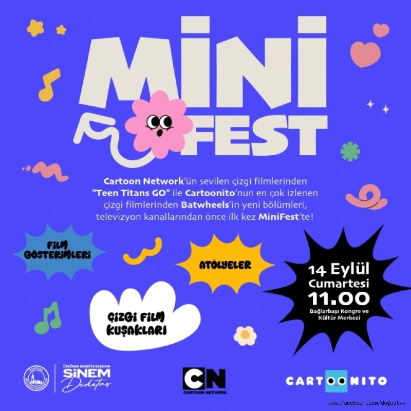 14 Eylül Cumartesi günü Bağlarbaşı Kongre ve Kültür Merkezi’nin avlusunda gerçekleşecek Mini Fest etkinliğinde çocuklar ve gençler için gün boyu atölyeler, film gösterimleri, çizgi film kuşağı, kostüm karakterler ile sosyalleşebilecekleri ve eğlenebilecekleri bir alan oluşturacak. Mini Fest kapsamında Cartoon Network & Cartoonito işbirliği ile Cartoon Network’te yayınlanan “Teen Titans GO” ve Cartoonito’da yayınlanan “Batwheels” çizgi filmlerinin yeni bölümlerden birer tane bölüm alanda gösterilecek.Çocuklar ve gençler tarafından çok sevilen “Kral Şakir” Mini Fest’te Çocuklar ve gençler tarafından çok sevilen “Kral Şakir” festivalde yer alacak. Çocuklar ve gençler çizgi dizi ile hoşça vakit geçirecek.Festival kapsamında Çocuk ve Gençlik Yayınları Derneği ile alanında uzman atölye eğitimcisi ile buluşma, seçilen bir kitapla tiyatro oyunu, filmle ilgili yaratıcı okuma-yazma, oyun, yaratıcı drama ve sanat atölyeleri de gerçekleşecek. Mini Fest kapsamında Gezgin Oyun Parkı da etkinlikte sürprizlerle yer alacak.