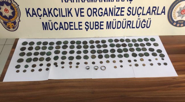 Kaçakçılık ve Organize Suçlarla Mücadele Şube Müdürlüğü Mali Büro Amirliği ekipleri, ihbar üzerine Güzelyurt Mahallesi Kahramanmaraş-Gaziantep karayolu üzerinde bir yolcu otobüsünü durdurdu. Otobüsteki yolculardan Y.Z.'nin yanındaki poşette yapılan aramada, 122 sikke ile 3 yüzük ele geçirildi.Y.Z., gözaltına alınırken, tarihi ser olarak değerlendirilen sikke ve yüzükler Kahramanmaraş Müze Müdürlüğü'ne gönderildi. Burada yapılan ön incelemede sikkelerin Roma ve Bizans dönemine ait olduğu belirlendi. Y.Z.'nin emniyetteki sorgusunun devam ettiği bildirildi.